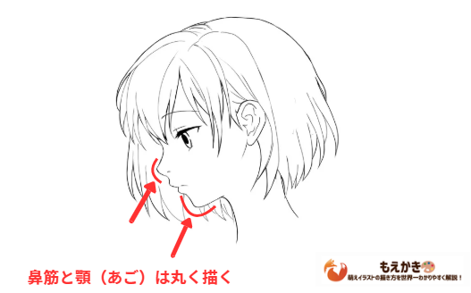 女性の横顔は鼻筋をゆるく曲げ、顎先も丸くします。