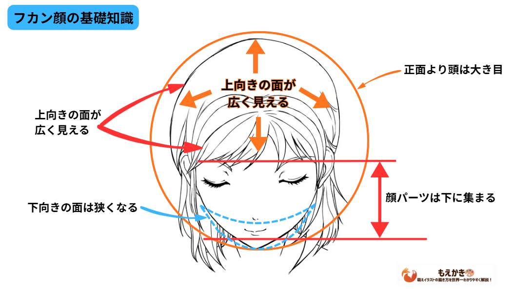 フカン顔を安定して描くためには、頭の「上側の面」が広く見える構造を理解することが重要です。