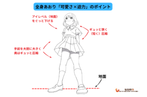 顔だけでなく全身の遠近の考え方も紹介するので、フカン構図を自然に描けるようになりたい方はぜひ参考にしてください。